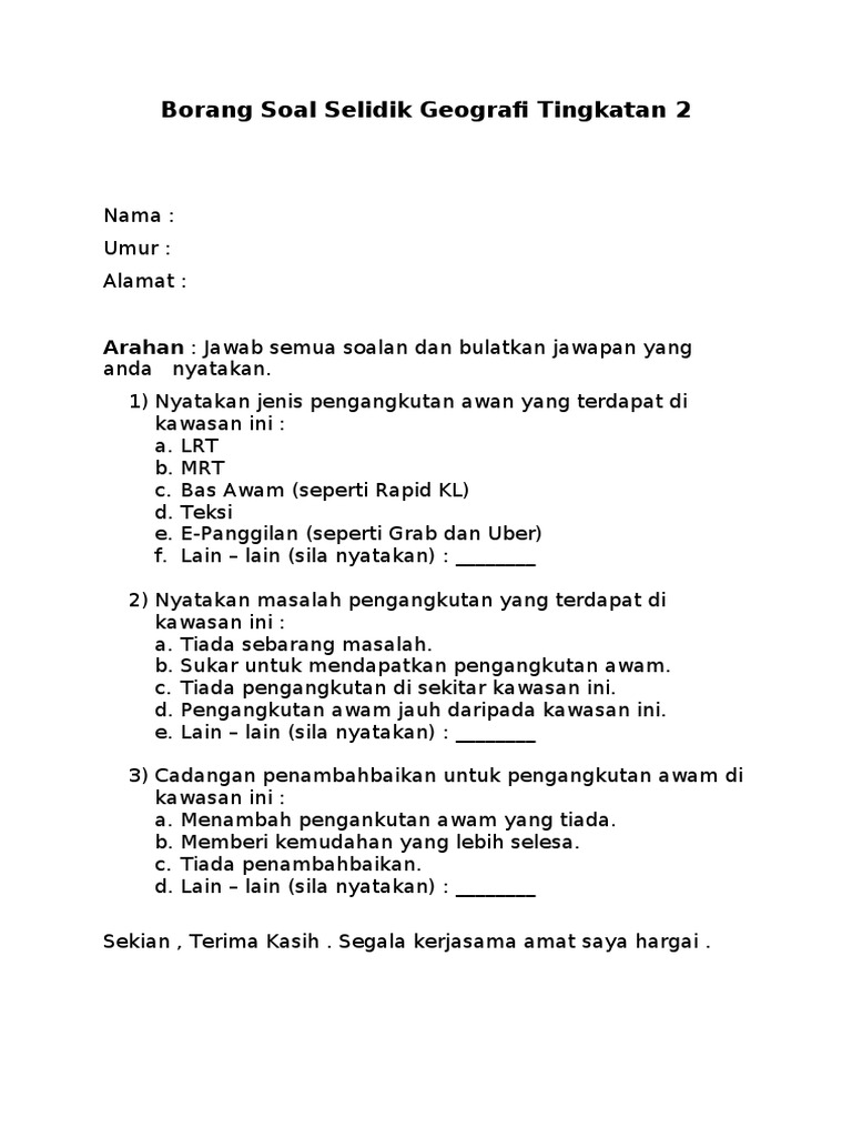 Borang Soal Selidik Geografi Tingkatan 2 Arahan Jawab Semua Soalan Dan Bulatkan Jawapan Yang