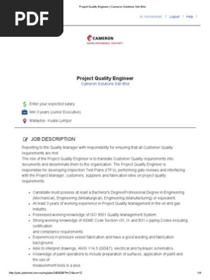 Project Quality Engineer Cameron Solutions Sdn Bhd Employment Technology