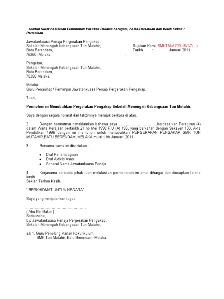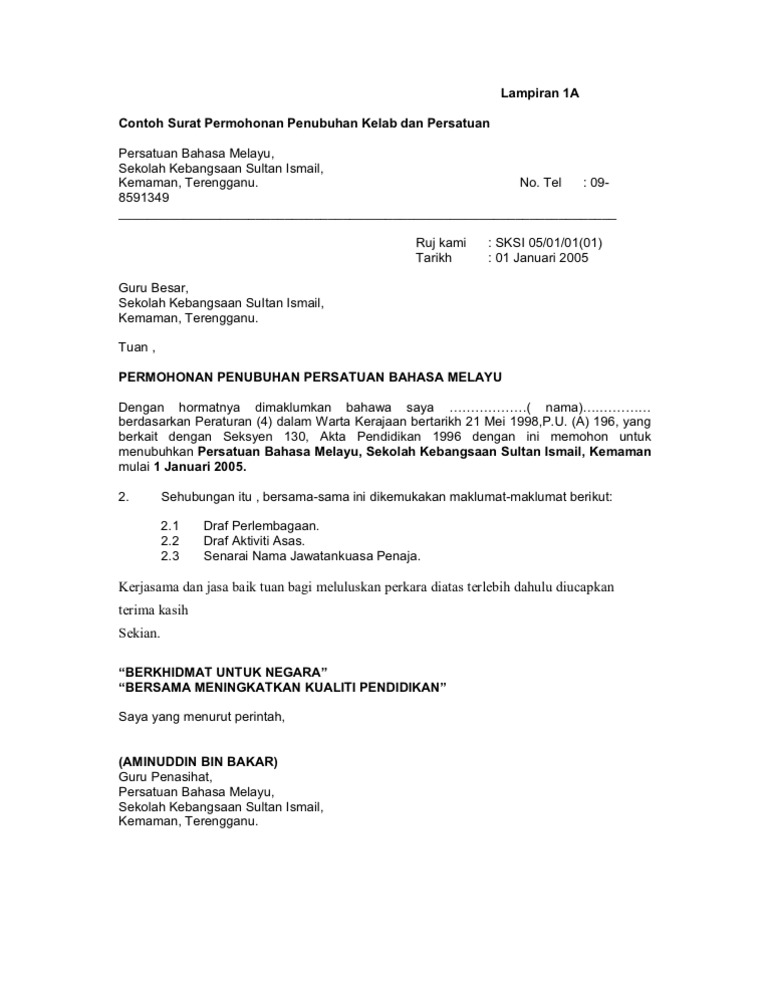 Contoh Surat Permohonan Penubuhan Kelab Dan Persatuan Bahasa Melayu