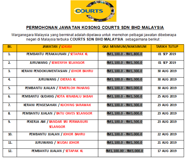 Kekosongan Terkini Di Courts Malaysia Sdn Bhd Pengambilan Kerani Semakjawatan Com Jawatan Kosong Terkini