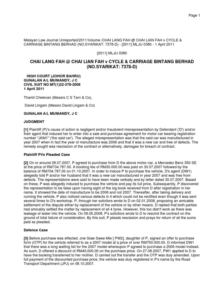 Chai Lang Fah Chai Lian Fah V Cycle Carr Misrepresentation Burden Of Proof Law