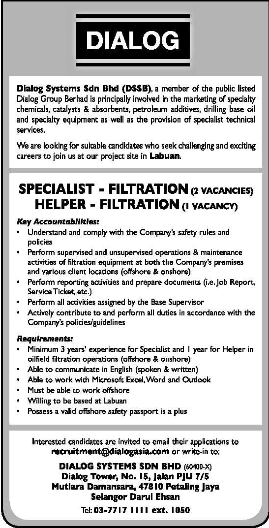 Oil Gas Vacancies Specialist Helper Filtration Dialog Labuan
