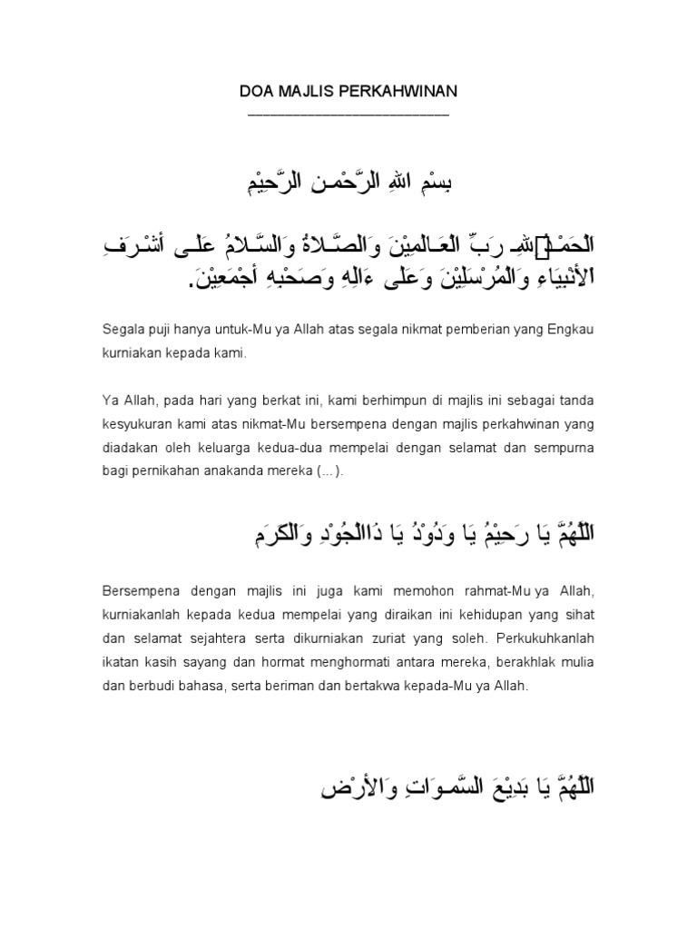 Doa untuk majlis perkahwinan. Doa majlis perkahwinan yang ringkas ini biasanya akan dibacakan oleh wakil pihak tuan rumah seperti ayah abang saudara mara lelaki terdekat mahupun imam ketika majlis. Mohon share doa ini untuk majlis perkahwinan saudara saya. Untuk perang gaza as membantu israel dengan 60 000 tan senjata.